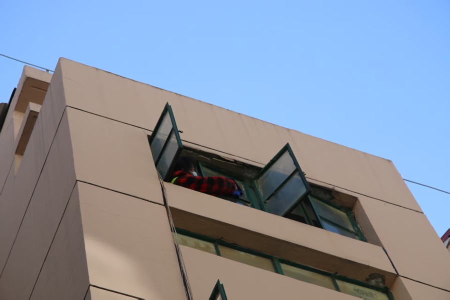 杨浦区隆昌路468弄,保利物业的开荒保洁进场。久不清理,楼道玻璃窗上的灰已积成石灰垢。保洁人员小心地用干抹布擦拭。但抹布不能上药水——架空线层层叠叠,最怕没绞干的药水滴落。