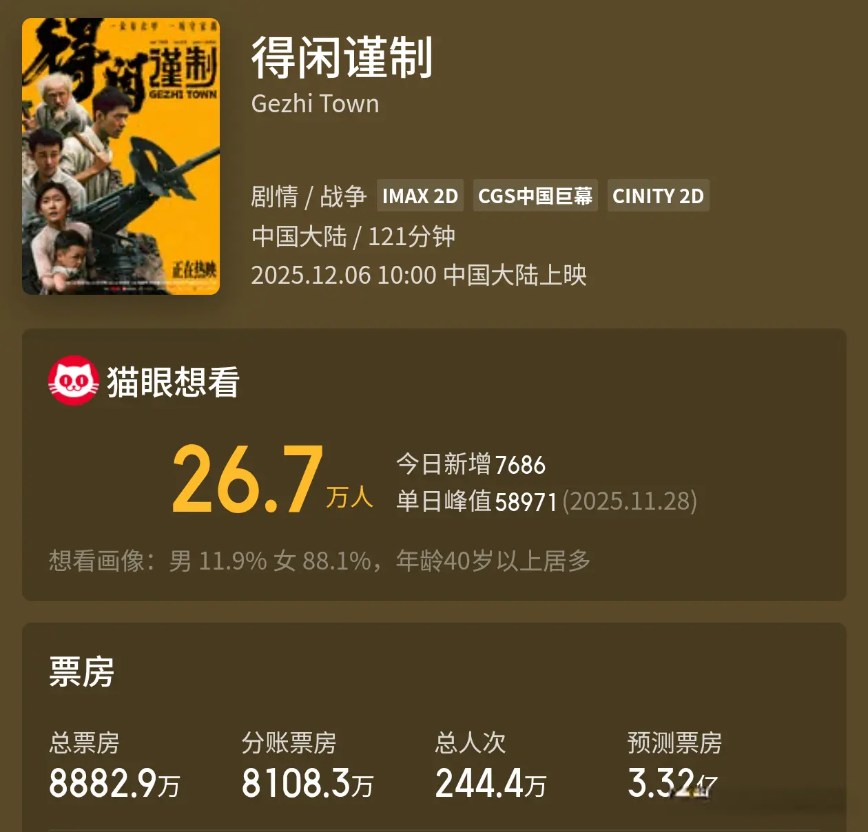 总票房预测也是3.32亿,不过还是有希望的,今年只要能破亿就算赢了,而且才上映半天。《得闲谨制》是正午阳光第一部电影,因为制作电视剧很强,很多人都在问好看吗?