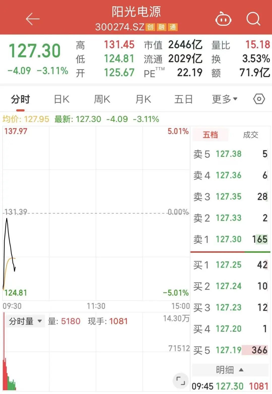 4月28日,A股光储龙头阳光电源(300274.SZ)跳空低开,盘中一度跌超5%,截至午间收盘反弹翻红,涨约0.5%,报132.1元/股。