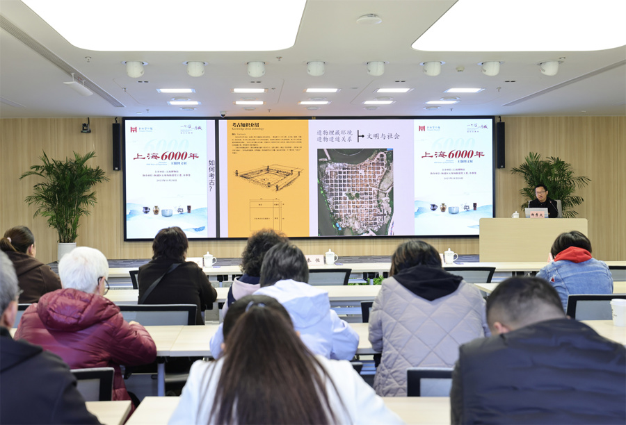考古专家、文博学者也继续走进社区开讲座,在文化中心的视听教室,专家以《“地书”揭示上海6000年》为题,结合上海博物馆“考古上海”展,从考古实证讲述上海六千年历史,同时解读“何以上海”的历史密码。为了让更多参观者深度了解文物背后的故事,本次展览还向参展观众提供观展手册,现场播放《魔都与新城》纪录片、青龙镇相关考古视频等,让居民更全面感受上海城市历史和文化。
