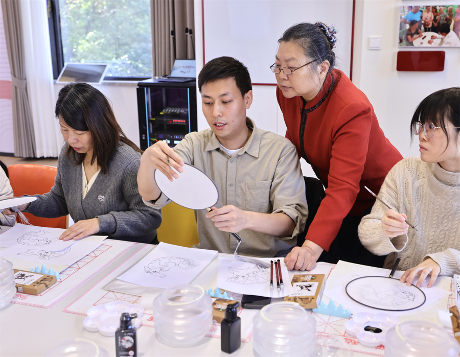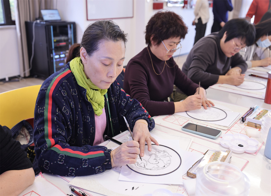 为方便不同年龄层居民观展,上博讲解员用“家常话”为居民解读文物故事,讲到“上海第一稻”时,联系城市周边稻田,聊起上海农业文明的延续;说青龙镇海上贸易,会结合社区外贸小店,类比古代“国际港口”的繁华;谈海派旗袍,还会邀请居民分享家中老旗袍故事。与此同时,作为配套活动,绘画体验工作坊同步开放,街道提供了笔墨和团扇,邀请了网络大V、青年艺术家陈汉煜向30多位社区居民面授国画技法,手把手地教她们怎么把猫咪的鼻子、毛发和肉垫描绘得活灵活现。
