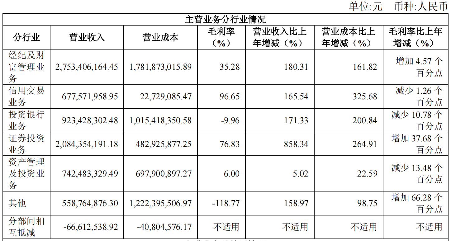 同时,信用交易业务实现营业收入6.78亿元,同比增加165.54%;投资银行业务实现营业收入9.23亿元,同比增加171.33%。资产管理及投资业务实现营业收入7.42亿元,同比增加5.02%。